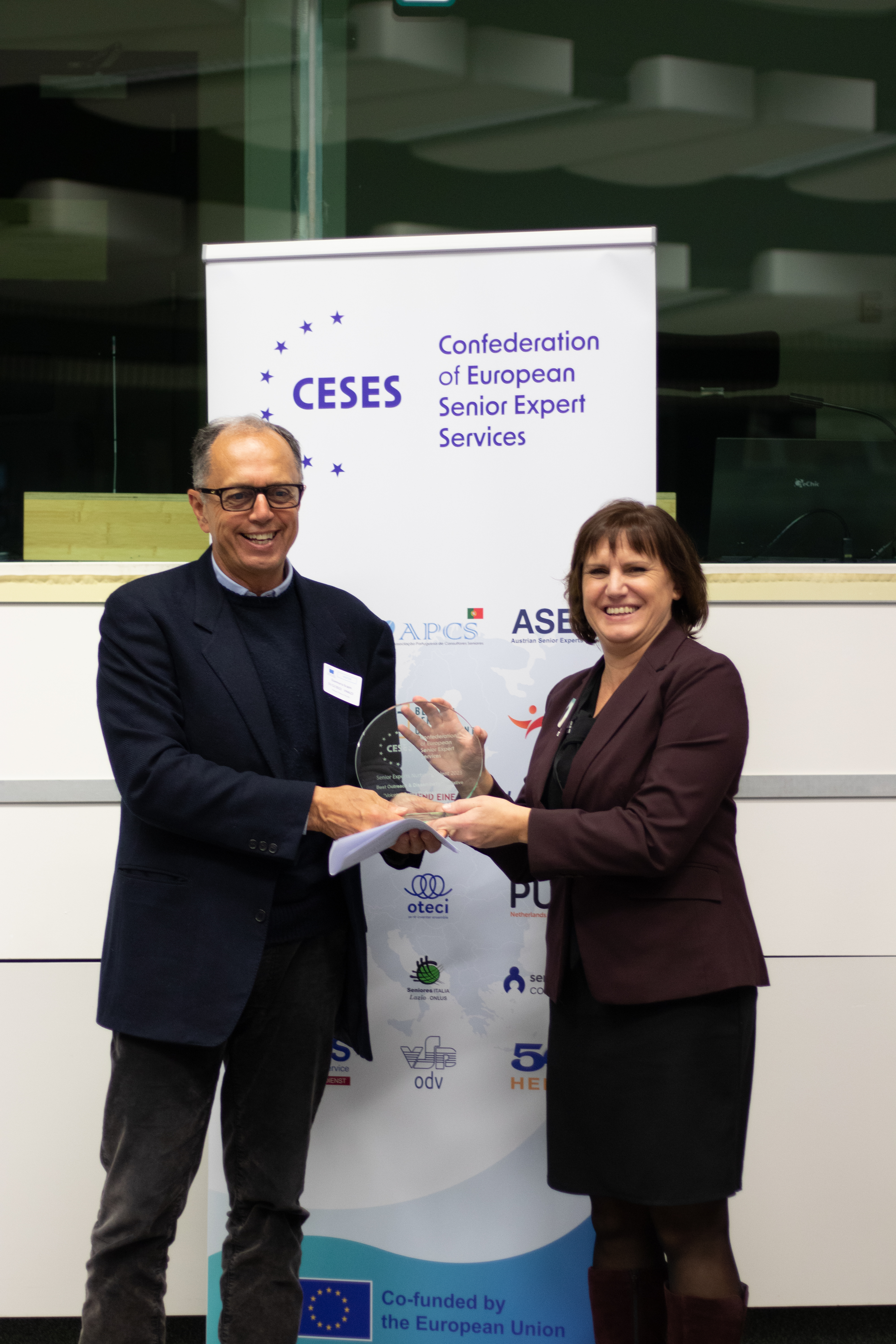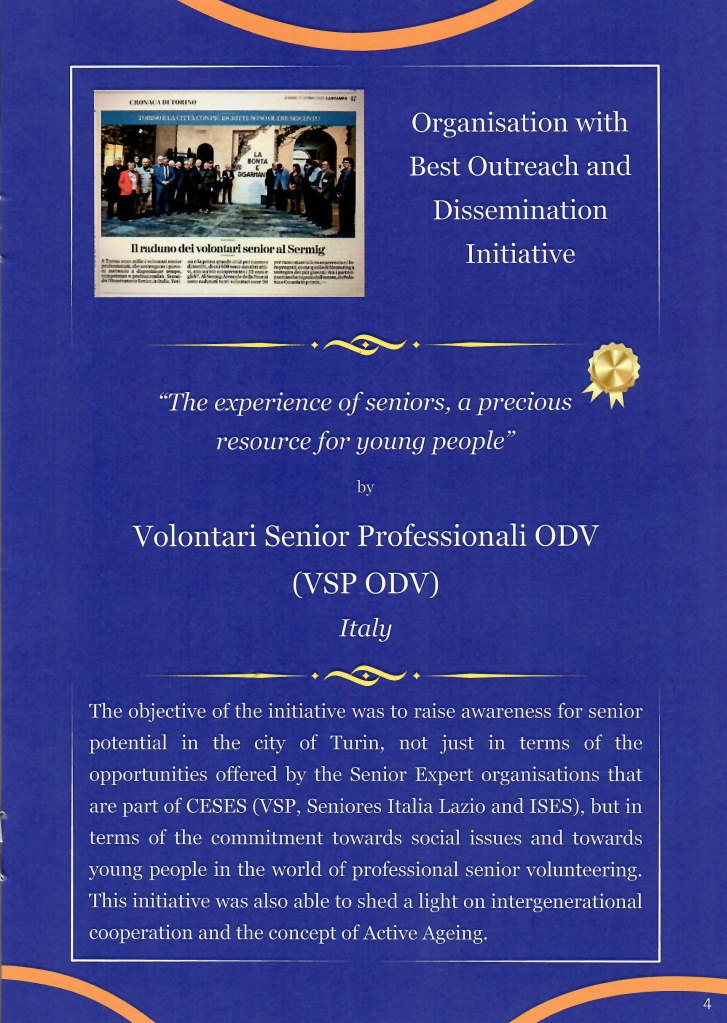 The President of CEV – Centre for European Volunteering, Gabriella Civico, presented the award for the best communication campaign and dissemination of volunteer values “Senior Professionals” to Gianmaria Scapin, President of VSP, Italy.